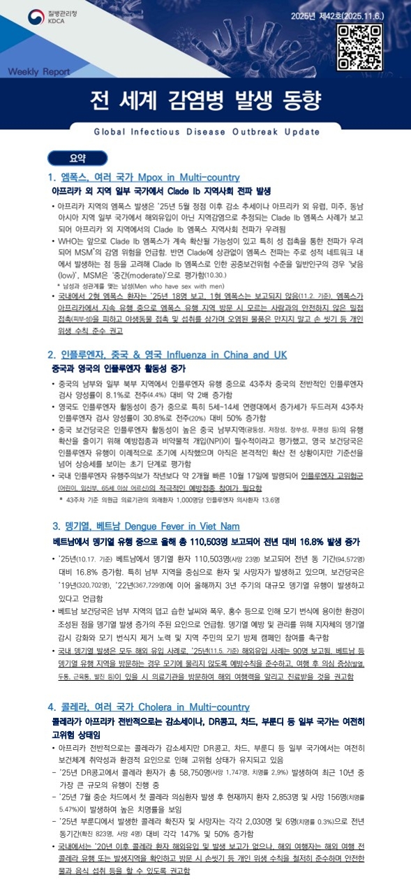 - 엠폭스(여러 국가), 인플루엔자(중국&영국), 뎅기열(베트남), 콜레라(여러 국가)