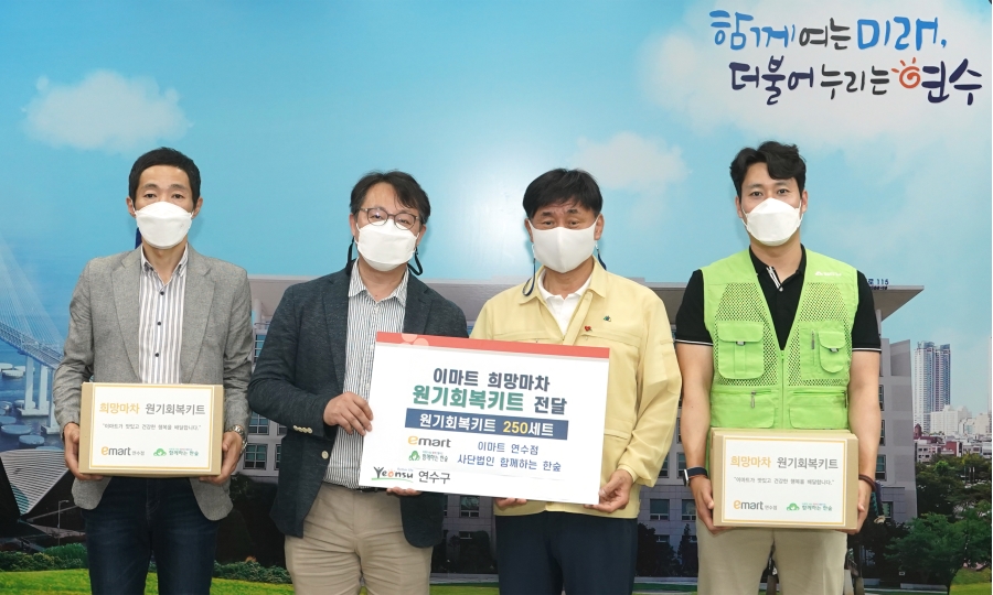 연수구(구청장 고남석)는 지난 21일 이마트 연수점(점장 김도영)으로부터 (사)함께하는 한숲을 통해 취약계층을 위한 코로나19 원기회복꾸러미 250박스를 전달받았다.