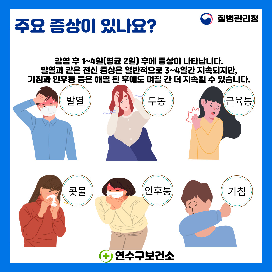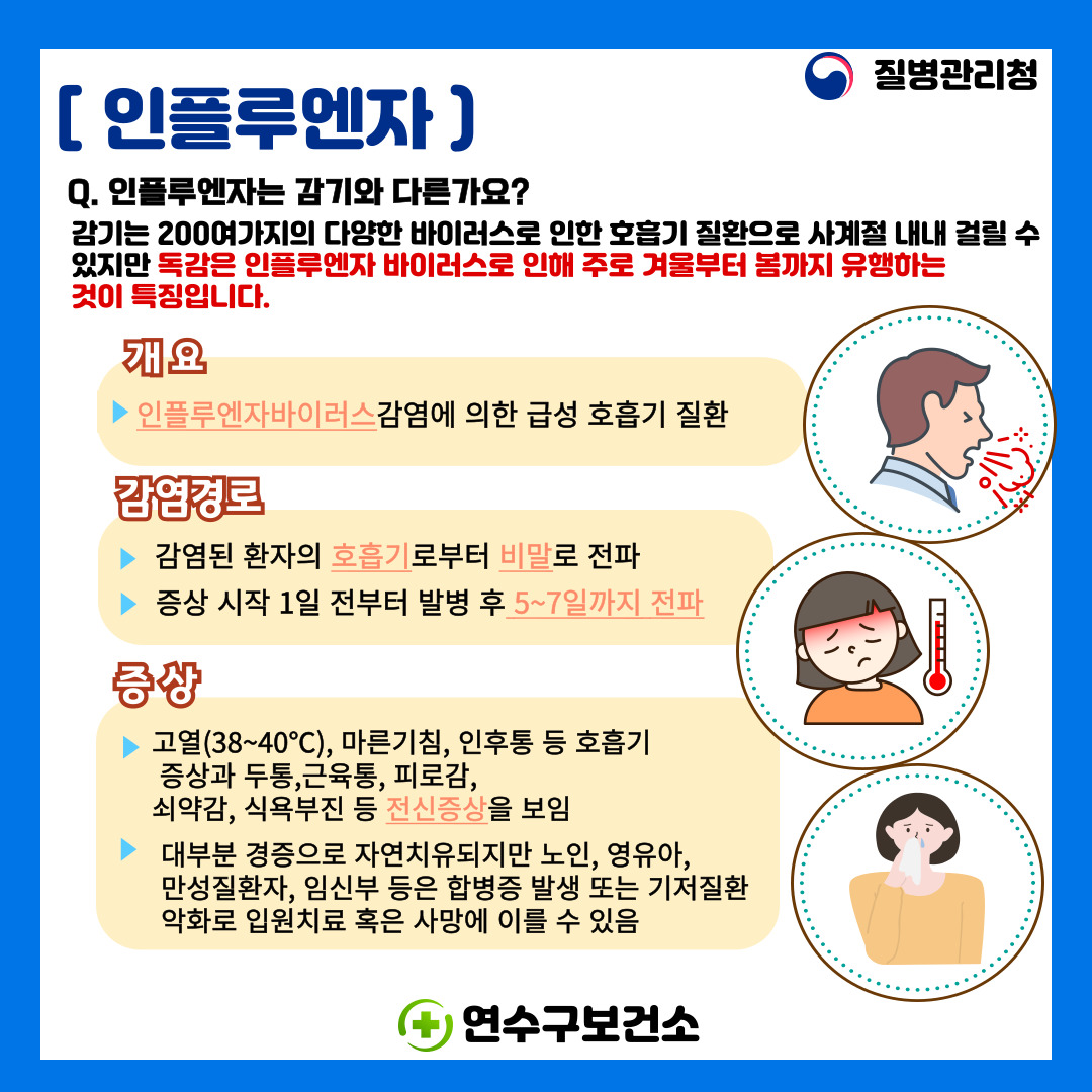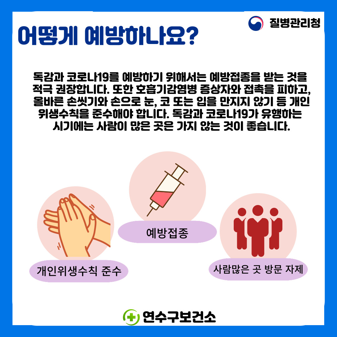 - 인플루엔자(독감)와 코로나19를 예방하기 위해서는 예방접종을 받는 것을 적극 권장합니다. 또한 호흡기 감염병 증상자와 접촉을 피하고,