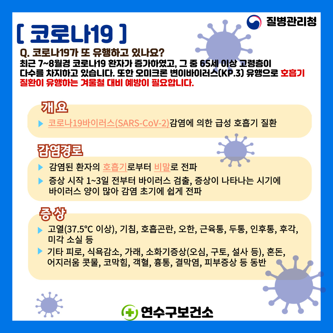 - 최근 7~8월경 코로나19 환자가 증가하였고, 그 중 65세 이상 고령층이 다수를 차지하고 있습니다. 또한 오미크론 변이바이러스(KP.3) 유행으로호흡기 질환이 유행하는 겨울철 대비 예방이 필요합니다.