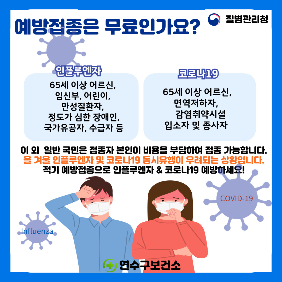 - 인플루엔자: 65세 이상 어르신, 임신부, 어린이, 만성질환자, 정도가 심한 장애인, 국가유공자, 수급자 등