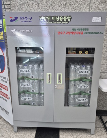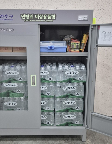 공습상황 시 구민을 보호하기 위한 식수, 렌턴, 응급처치세트 등이 포함된 비상용품함을 대피시설에 설치함